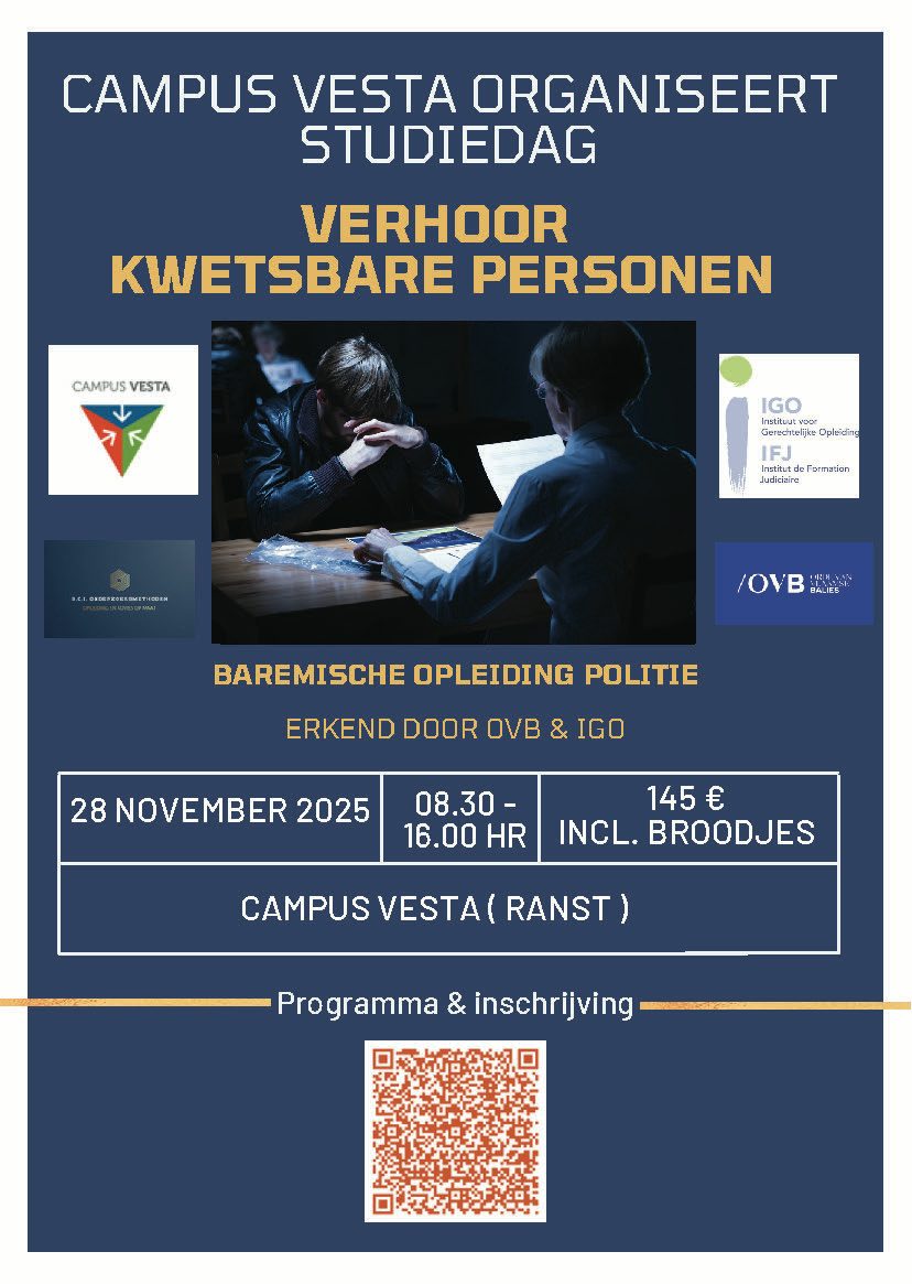 Op vrijdag 28 november van 8.30 tot 16 uur organiseert Campus Vesta een studiedag ‘verhoor kwetsbare personen’. Deze studiedag heeft als doel om de kwaliteit en effectiviteit van verhoren van kwetsbare personen te verbeteren.