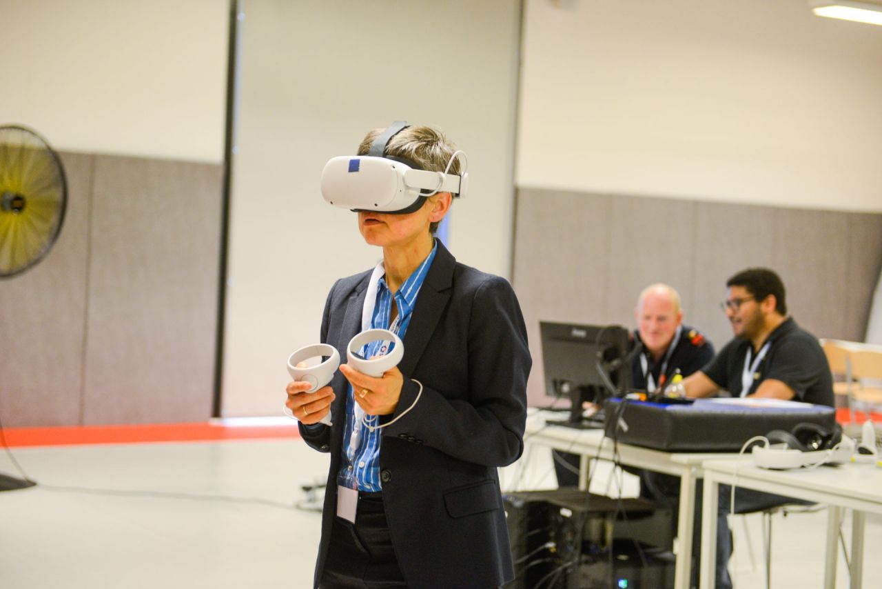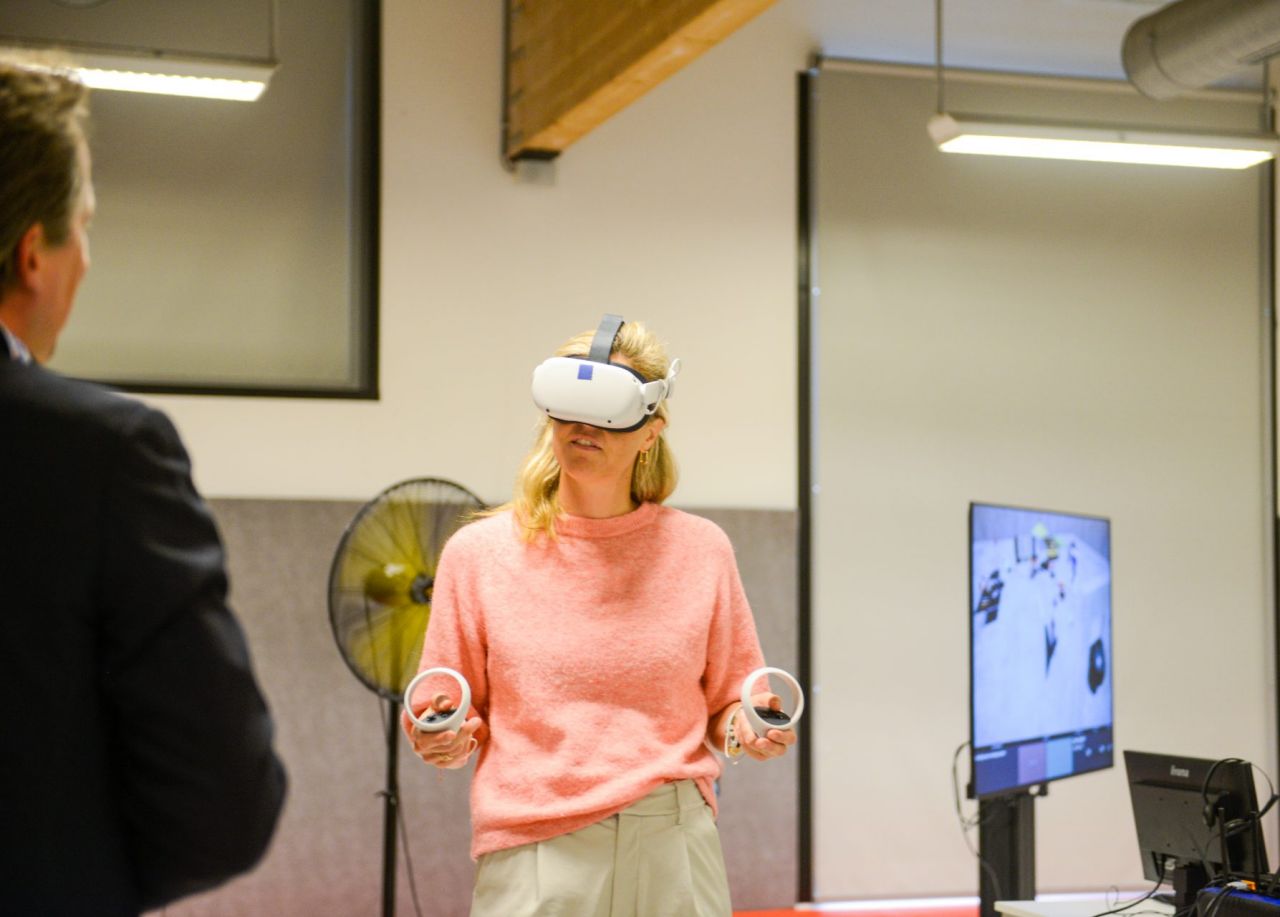 Gouverneur Cathy Berx waagt zich in de virtuele realiteit.