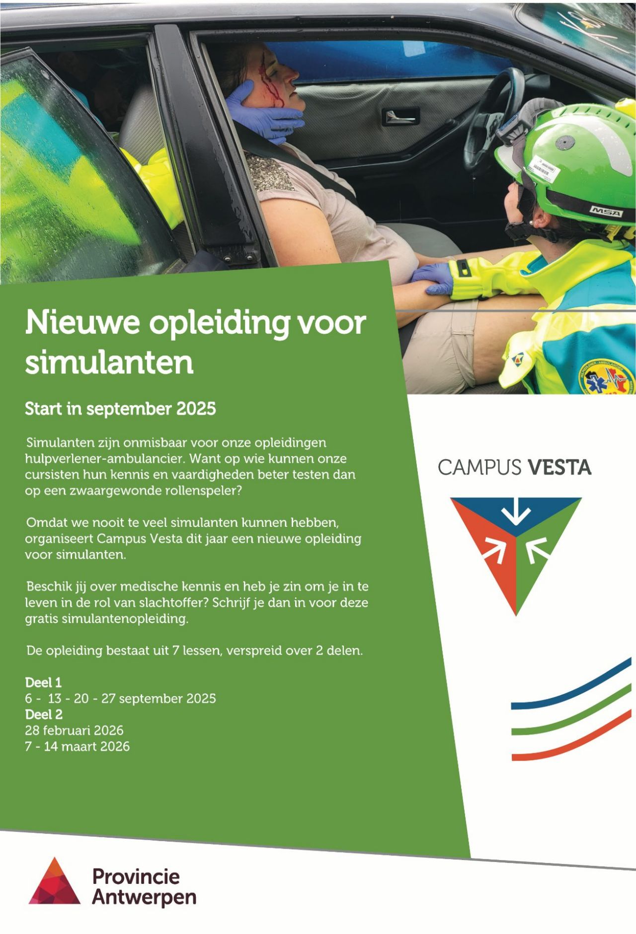 Simulanten zijn onmisbaar voor onze opleidingen hulpverlener-ambulancier. Hoe anders dan op een hevig bloedende, bewusteloze of zwaargewonde rollenspeler zouden onze cursisten hun kennis en vaardigheden kunnen testen?