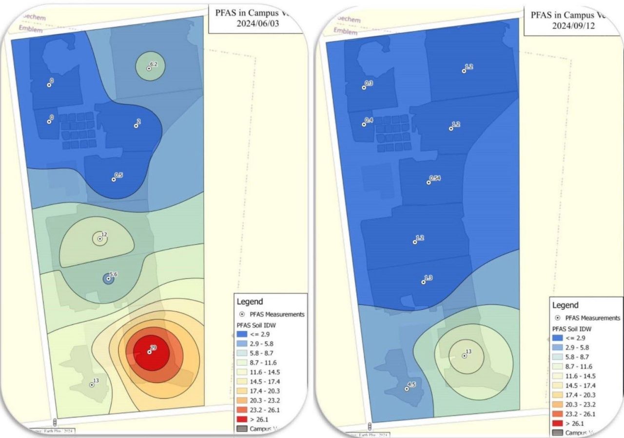 “Positief ook is dat de PFAS niet terechtkomt in het grondwater. Uit stalen die genomen zijn op een halve meter diepte blijkt dat de vervuiling in de bovenste 20 cm van de bodem blijft zitten en dat er in het grondwater niets verandert. Dat betekent dat de PFAS ook niet weggespoeld kan zijn.”