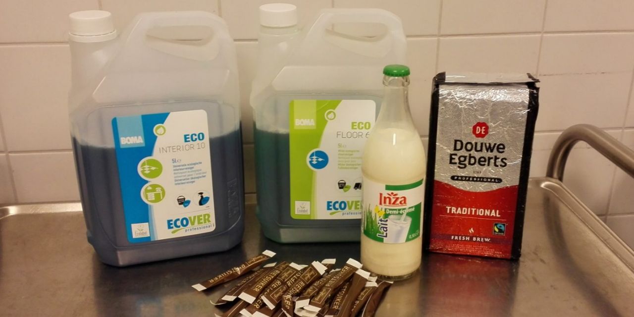 Alle entiteiten van de provincie Antwerpen volgen de duurzame aankoopgids. Dat zorgt ervoor dat je op Campus Vesta fairtrade koffie drinkt, je veel gerecycleerd materiaal tegenkomt, we met ecologische producten poetsen en we bij elke aankoop willen stilstaan bij de impact ervan op het milieu.