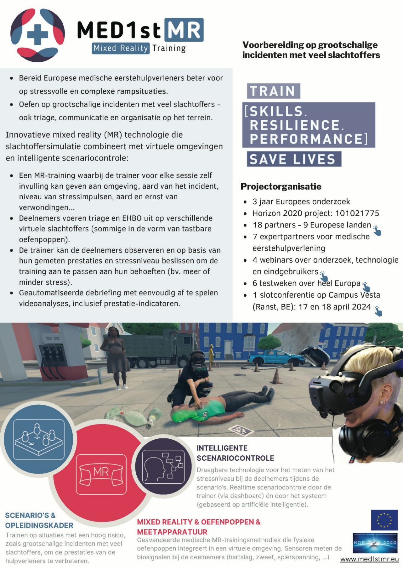 Medische eerstehulpverleners beter voorbereiden op stressvolle en complexe rampsituaties door ze via mixed reality (MR) in een virtuele omgeving te laten oefenen op poppen met een hartslag en longfunctie… Dat is de inzet van het baanbrekende Europese project MED1stMR, waaraan Campus Vesta intussen twee jaar als enige Belgische partner meewerkt.