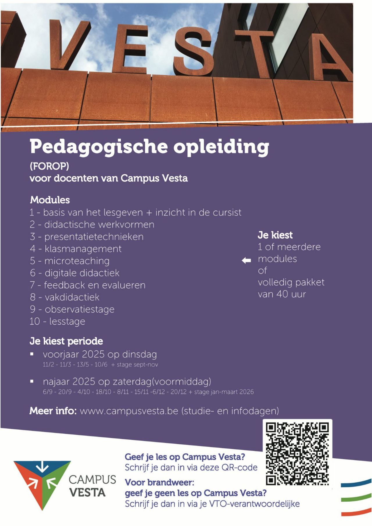 Wil je je als docent bij Campus Vesta verder ontwikkelen en pedagogisch sterker voor de dag komen? Wij bieden in 2025 een uitgebreide Pedagogische Opleiding (FOROP) aan. Deze cursus bestaat uit tien modules: van basis lesgeven tot digitale didactiek en feedback en evaluatie.